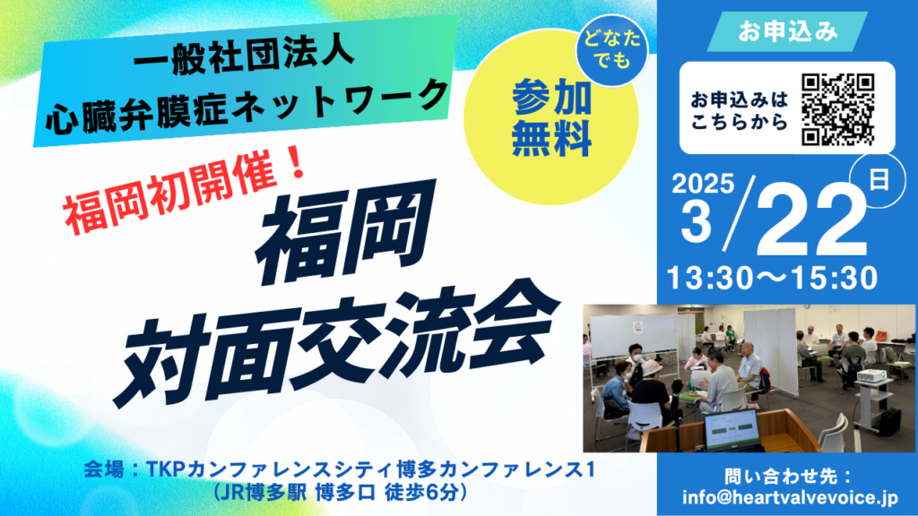 心臓弁膜症ネットワークは、2026年3月22日(日)に福岡県の博多駅近くで対面交流会を開催いたします。東京都内以外の開催は会としては初めての試みです。
