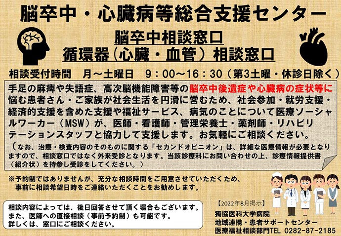 本法律の基本的施策や同対策推進基本計画並びに日本脳卒中学会と日本循環器学会が公表している「脳卒中と循環器病克服5ヵ年計画」においても包括的相談窓口の設置が求められていることを受け、2020年12月に地域連携・患者サポートセンター医療福祉相談部門に「脳卒中相談窓口、循環器(心臓、血管)相談窓口」を設置いたしました。相談窓口の主な役割